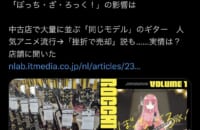 【画像】ぼざろ作者、中古店にぼっちのギターが大量に並んでいるニュースをリツイート