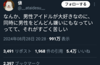 【悲報】女さん「男性アイドルは好きなのに現実の男は嫌い…」←5.4万いいね!